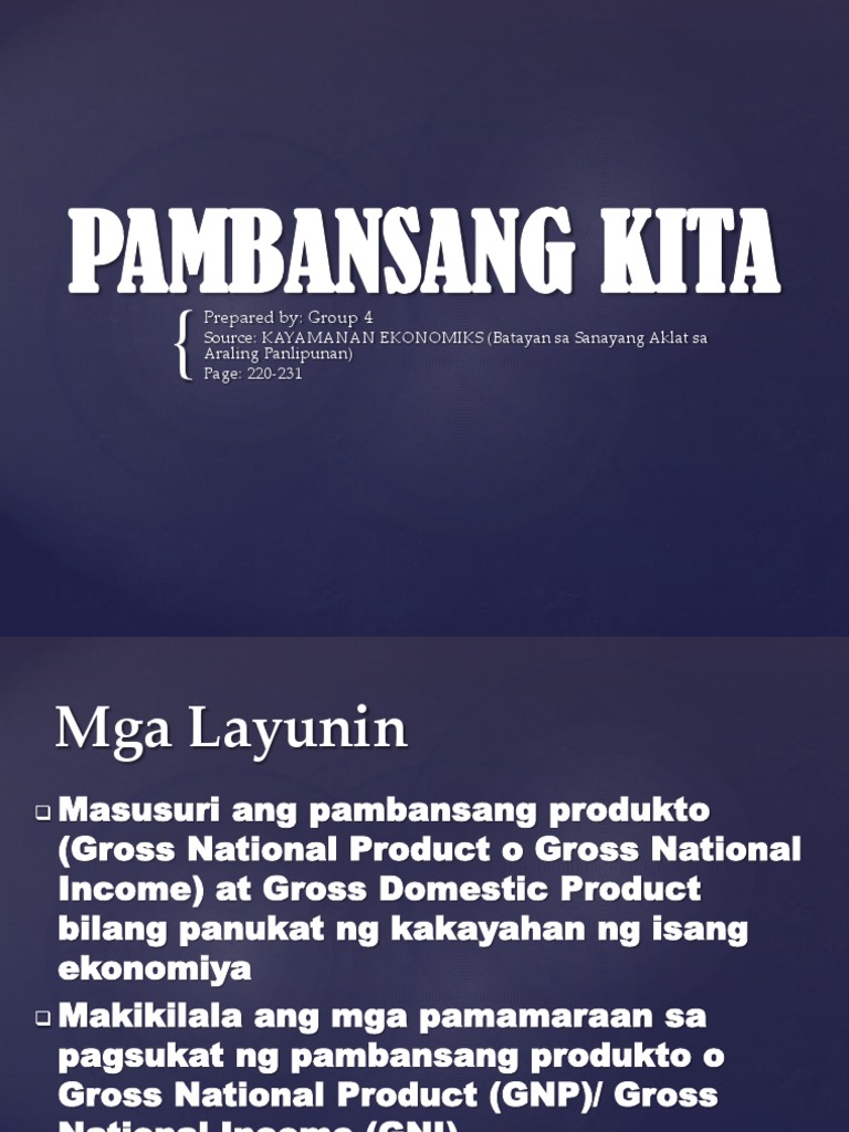 Pambansang kita By Group 1 10-OHSP Farah Mae Cristobal. Ang sistema ng pagsukat sa pambasang kita ay nakapagbibigay ng ideya tungkol sa antas ng produksiyon ng ekonomiya sa isang partikular na taon at maipaliwanag kung bakit ganito kalaki o kababa ang produksiyon ng bansa 2. Pakikidagdagan yung ibang topic ng impormasyon para mas malinaw ang ibig sabihin ng bawat isa.