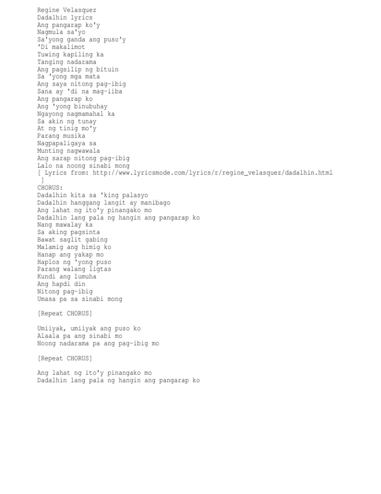 Dadalhin kita sa king palasyo Dadalhin hanggang langit ay manibago Ang lahat ng itoy pinangako mo Dadalhin lang pala ng hangin ang pangarap ko Nang mawalay ka Sa aking pagsinta Bawat saglit gabing Malamig ang himig ko Hanap ang yakap mo Haplos ng yong puso Parang walang ligtas Kundi ang lumuha Ang hapdi din Nitong pag-ibig Umasa pa sa sinabi. Chorus F Bb Gm C Dadalhin kita sa aking palasyo F Dm Gm C Dadalhin hanggang langit ay manibago F Bb Gm C Dm-Bb Ang lahat ng itoy pinangako mo Gm Am Bb C F-Bb-Gm-C Dadalhin lang pala ng hangin ang pangarap ko F C Nang mawalay ka sa aking pagsinta Gm C Bawat saglit gabing lamig ang himig ko F C Hanap ang yakap mo haplos ng yong puso Gm C Parang. Join Facebook to connect with Dadalhin Kita Sa Langit and others you may know.